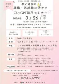2026年02月 金沢 【定員に達しました!】パソコン基礎講座 2026年02月27日 石川県本多の森庁舎2階 パソコンルーム 各日8名 2026年03月 加賀 【3月26日 (木) 開催!】就職・再就職に活かすChatGPT活用セミナーin小松 2026年03月26日 小松市民センター ミーティングルーム 10名